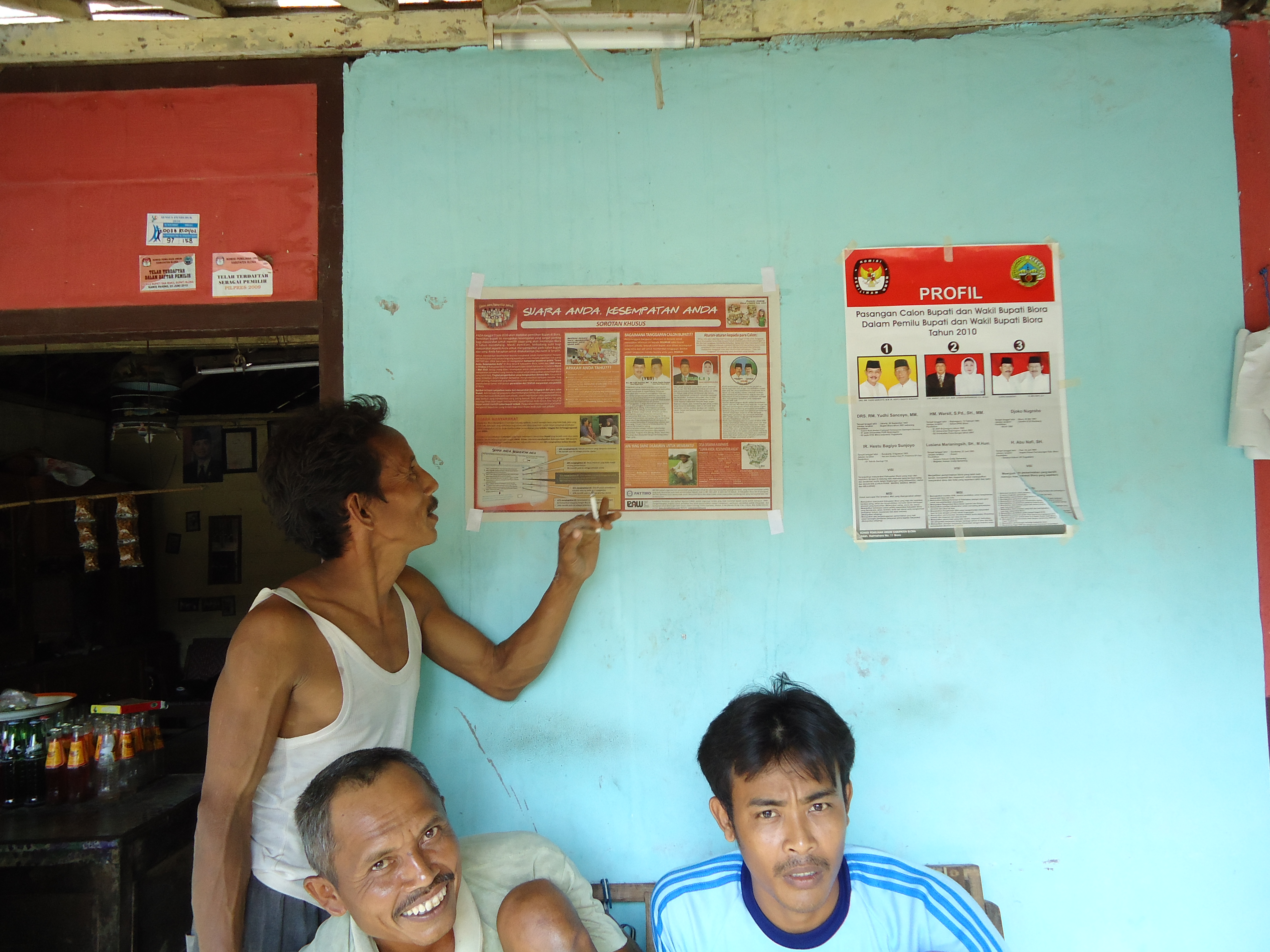 The voter education activity was also paired with a randomized evaluation to measure whether it did indeed have an impact on mobilizing voter turnout and helping voters make more informed decisions at the polls. This evaluation utilized the fact that DIVA has limited distribution throughout Blora. Ninety-four villages (and more than 400 communinities) were randomly selected for a more intensive distribution of the voter education materials. Half of these villages were villages in which the original Your Voice, Your Opportunitycampaign was conducted while the other half had not been included in the original campaign. In randomly selected villages and communities, copies of the special feature were posted in public places and distributed both to local leaders and ordinary citizens. By analyzing electoral results at the polling station level, we will be able to investigate whether the campaign and voter education materials had on impact election outcomes.